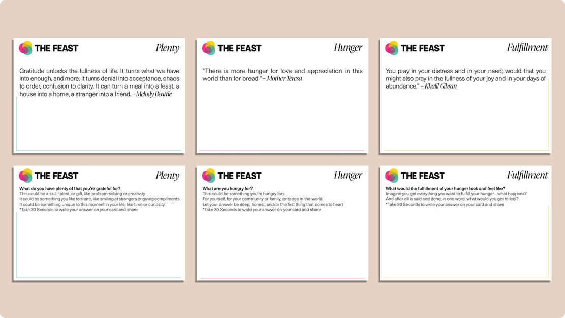 - Anchor the experience — everyone leaves with a takeaway card that carries the Feast into their daily life.
